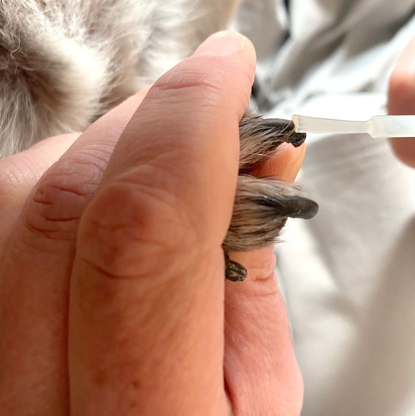 Der Hund befindet sich in einer ihm angenehmen Position, in der Du gut an die Pfoten gelangst. Trage nun den Kleber dünn im unteren Drittel der Kralle auf.